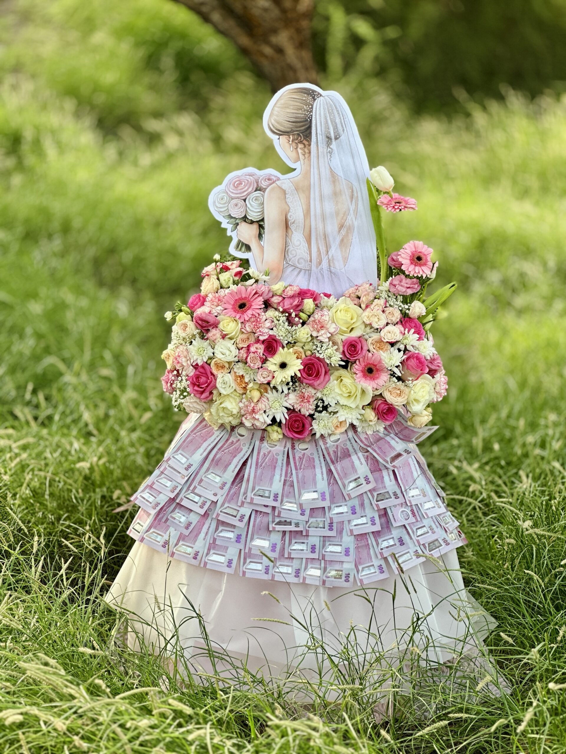 This luxury design features a detailed handcrafted structure with a floral top arrangement and a flowing money skirt, creating a unique and unforgettable gift perfect for weddings, engagements, birthdays, and special celebrations.