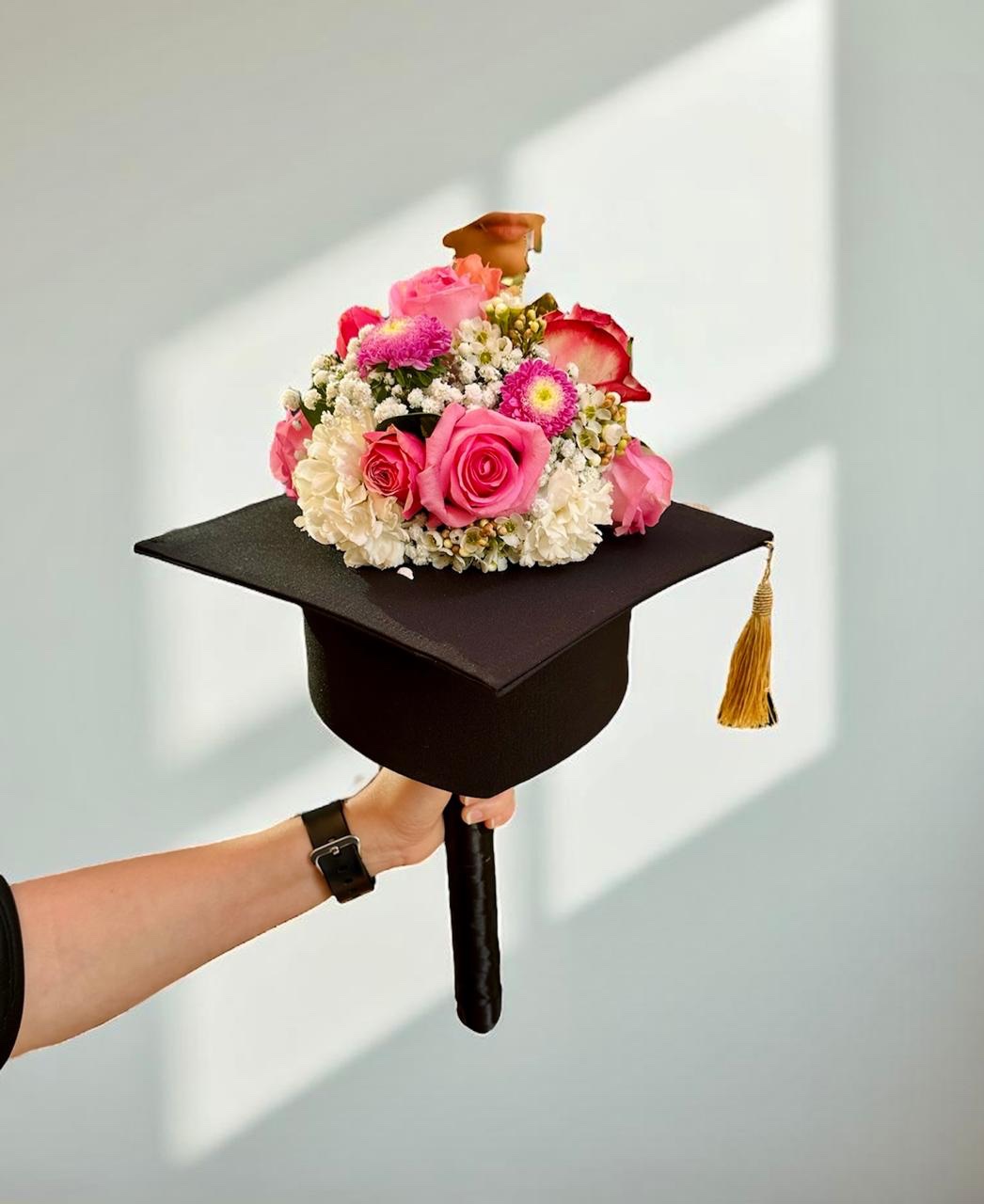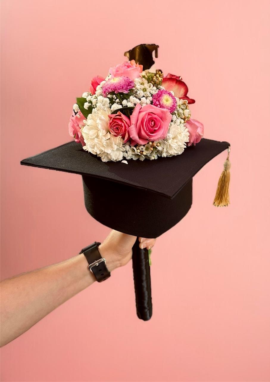 Celebrate graduation in style with our elegant Graduation Bloom Bouquet, featuring fresh pink roses, delicate white filler flowers, and a stylish black graduation cap design. This unique bouquet is perfect for congratulating graduates, capturing memories, and making their special day unforgettable. Ideal for university graduations, school achievements, and academic milestones. Available for same-day flower delivery.