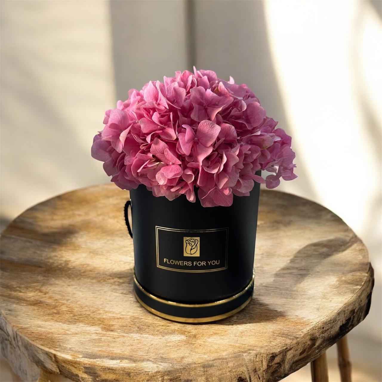 Soft, elegant, and timeless — this beautiful arrangement of fresh pink hydrangeas is designed to impress. Featuring full, delicate blooms arranged in a premium black hat box with gold detailing, it brings a touch of sophistication and warmth to any setting. The gentle pink tones make it an ideal gift for birthdays, celebrations, thank-you moments, or stylish home décor.