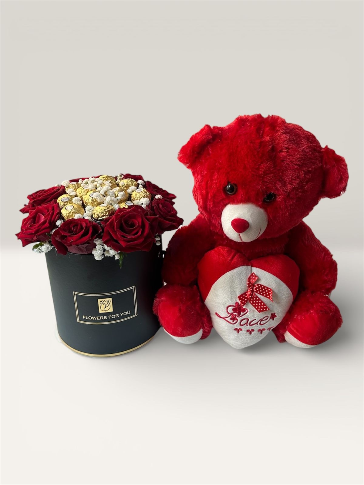This beautifully curated arrangement features fresh red roses in a premium black flower box, topped with Ferrero Rocher chocolates, paired with a soft red teddy bear holding a love heart.
