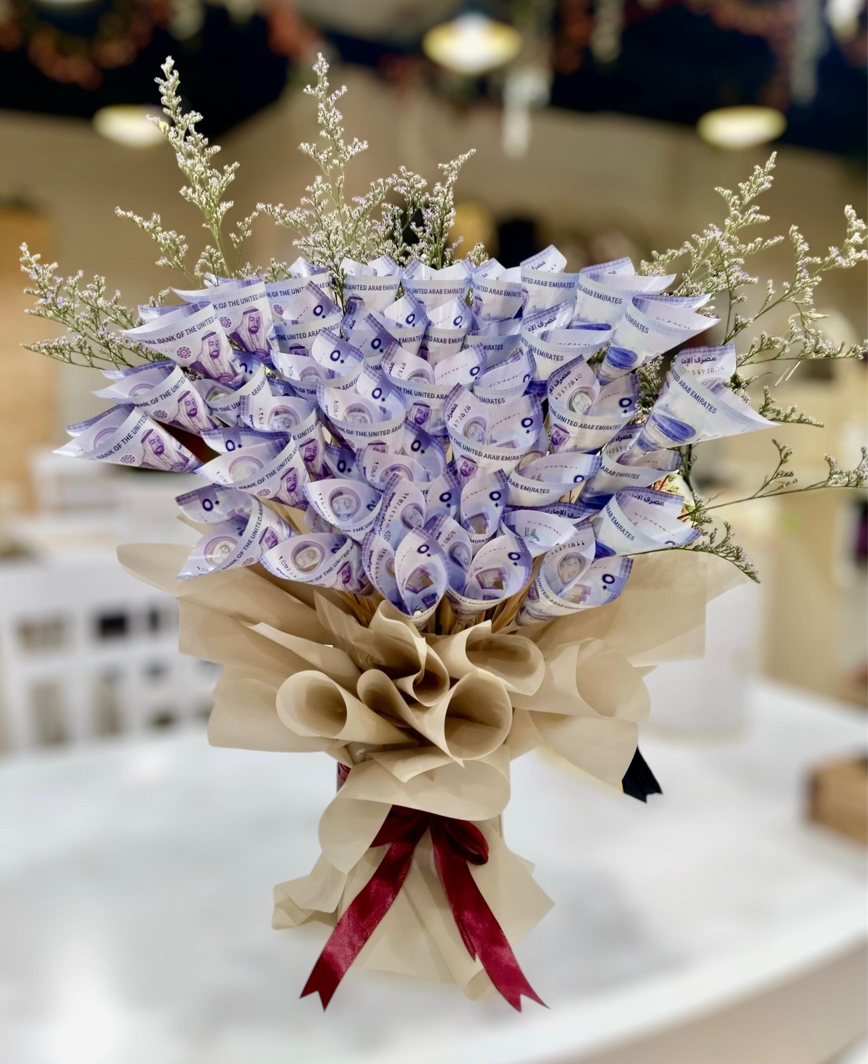 A beautiful royal money bouquet arrangement with 50 money notes.