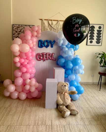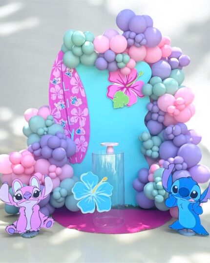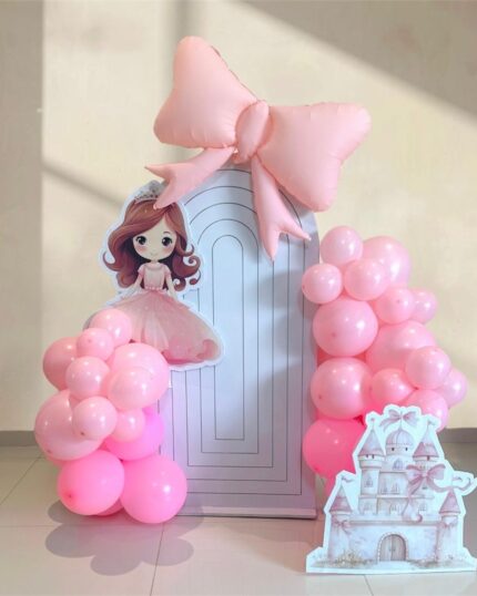 A soft and dreamy princess-themed balloon backdrop designed in delicate shades of pink, finished with elegant details and whimsical illustrations.